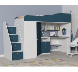 Второй вид кроватей-чердаков рассчитан на возраст детей от пяти лет. Спальное место в таком случае располагается на высоте 1,3-1,6 метра. На первом ярусе чаще всего есть шкаф и рабочая зона в формате письменного стола и книжных полок.