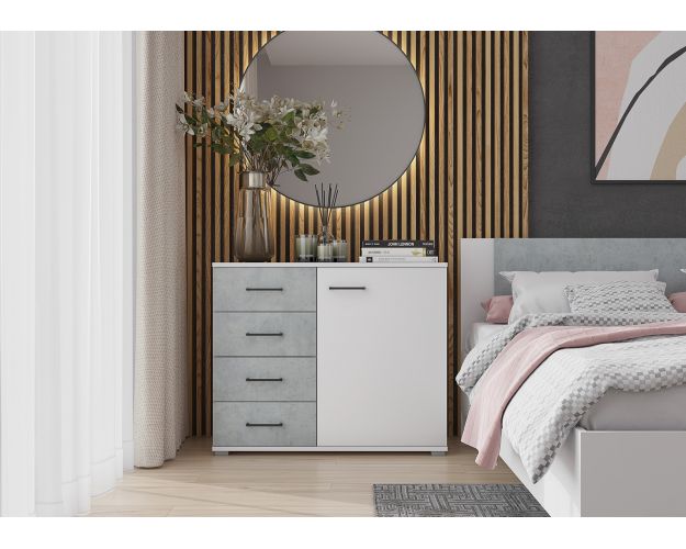 Комод разделён на 2 части. Слева ящики, справа отделение с полкой. Ручки пластмассовые, отличительная особенность – бархатные на ощупь.